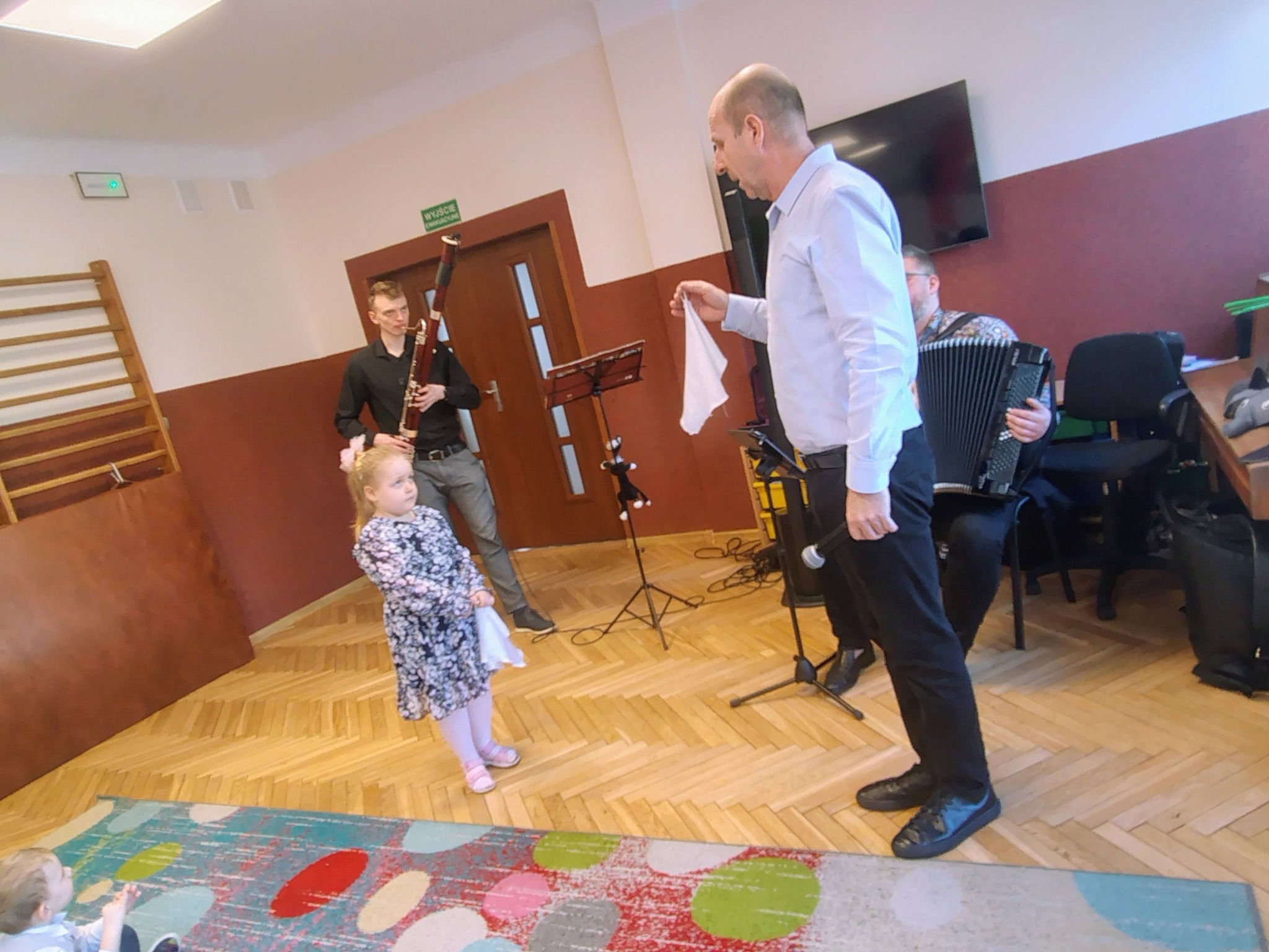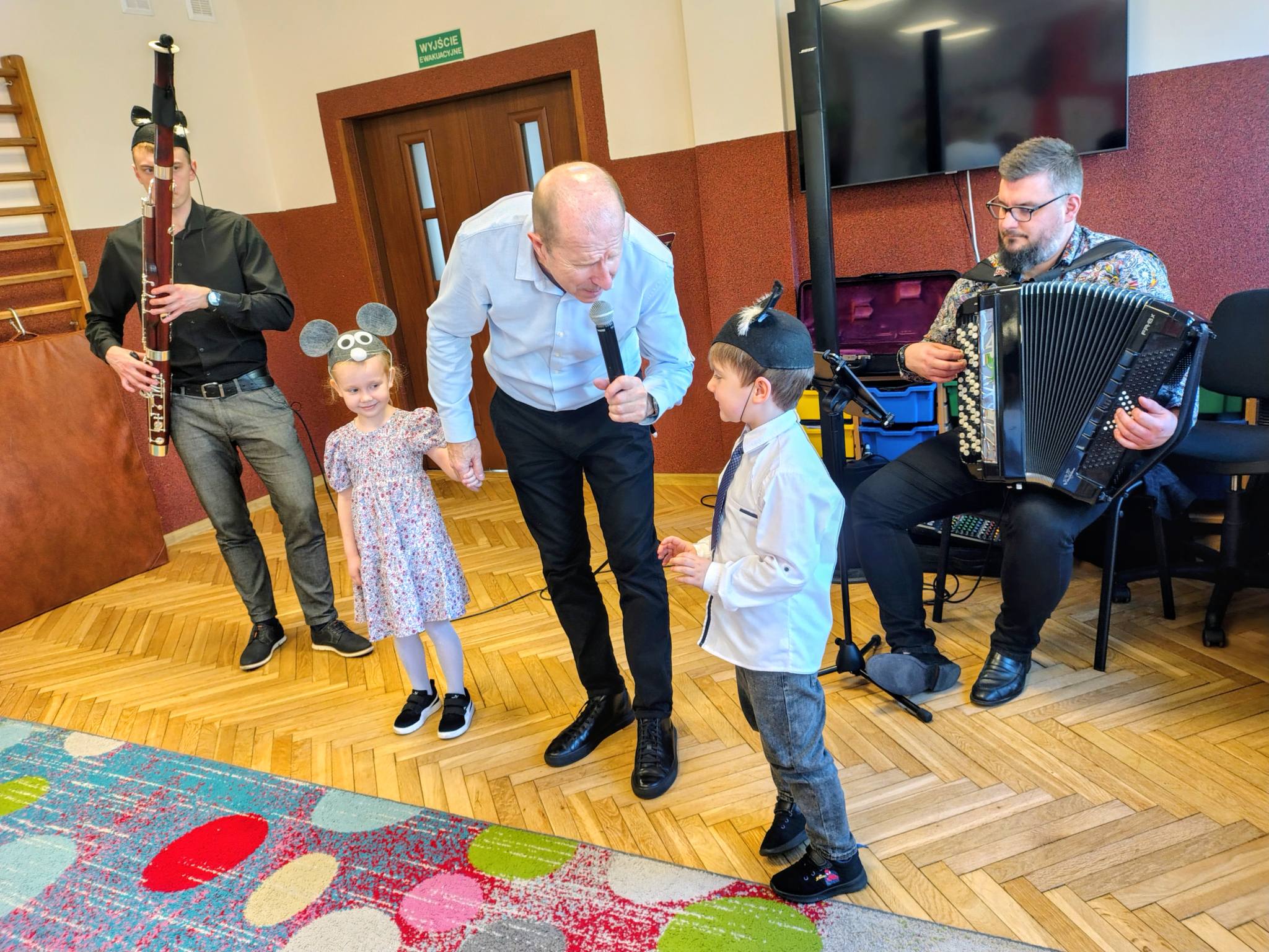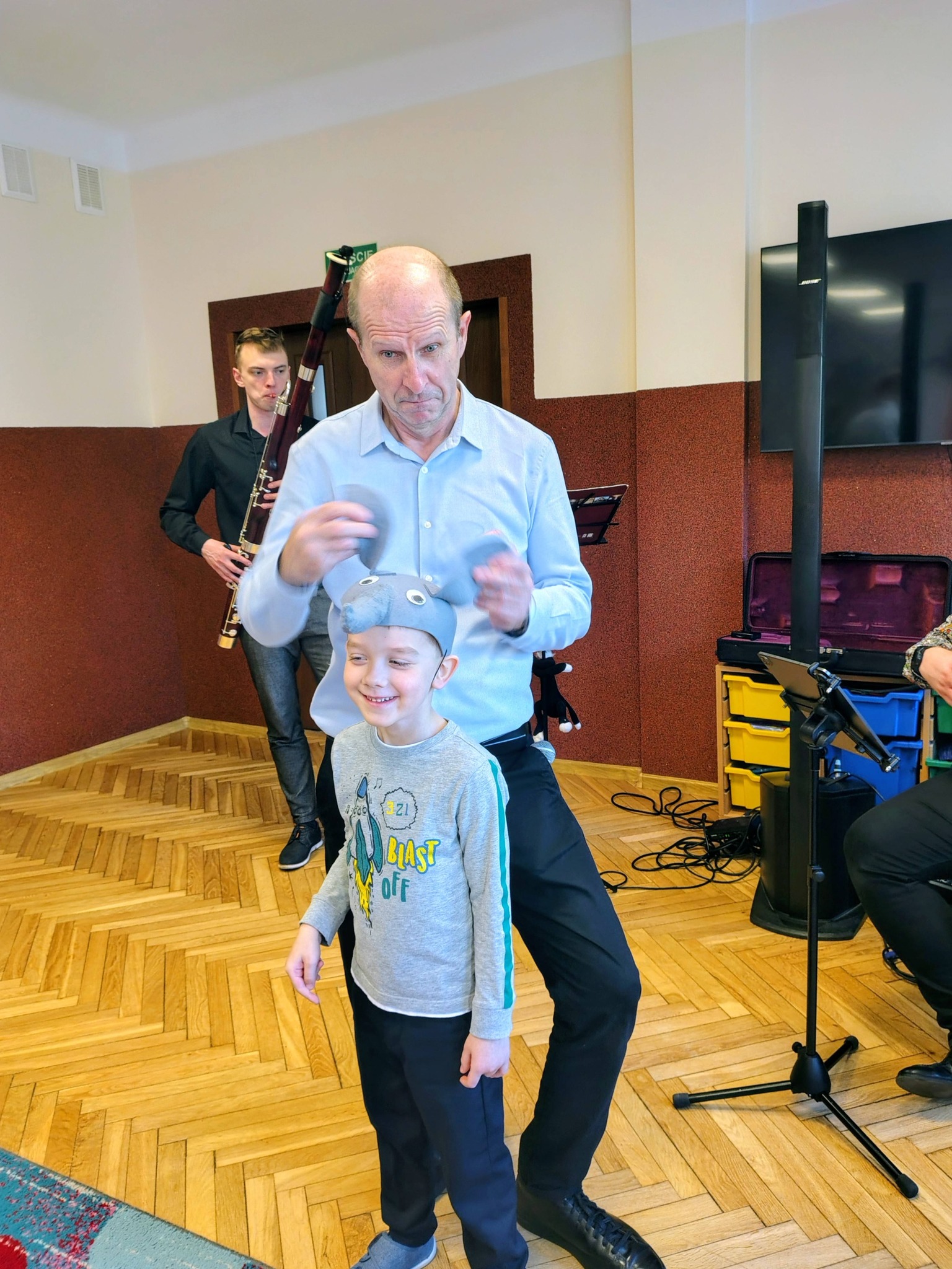 Dzisiejszy koncert był prawdziwą podróżą przez świat muzyki i wyobraźni. Najmłodsi słuchacze mieli okazję poznać niezwykły instrument – fagot. Dzieci usłyszały jego charakterystyczne, niskie i ciepłe brzmienie w utworze „Zabawa w kozackich rozbójników”, które od razu pobudziło muzyczną wyobraźnię.. Następnie przenieśliśmy się do czasów dawnych tańców dworskich. Mali melomani mogli zobaczyć i usłyszeć, jak tańczy się menueta – z eleganckimi krokami i pięknymi ukłonami, niczym na prawdziwym balu. Potem nasza muzyczna wyprawa zaprowadziła nas do ZOO! Tam spotkaliśmy słonia i wysłuchaliśmy utworu „Słoń” z „Karnawału zwierząt” Camille’a Saint-Saënsa, w którym fagot w zabawny sposób naśladował ciężkie kroki wielkiego zwierzęcia. Kolejnym przystankiem była wiosna – rozbrzmiały trzy części „Wiosny” Antonio Vivaldiego, która wprowadziła nas w radosny, pełen śpiewu ptaków i budzącej się natury nastrój. Na zakończenie wszyscy wspólnie zaśpiewaliśmy Balladę o myszce, kocie i fagocie, a nasz koncert zakończył się wyjątkowym momentem – niskie dźwięki fagotu obudziły ze snu zimowego niedźwiedzia, który spał bardzo mocno po długiej zimie! Dziękujemy naszym gościom za wspaniałą energię, uśmiechy i wspólne muzykowanie.