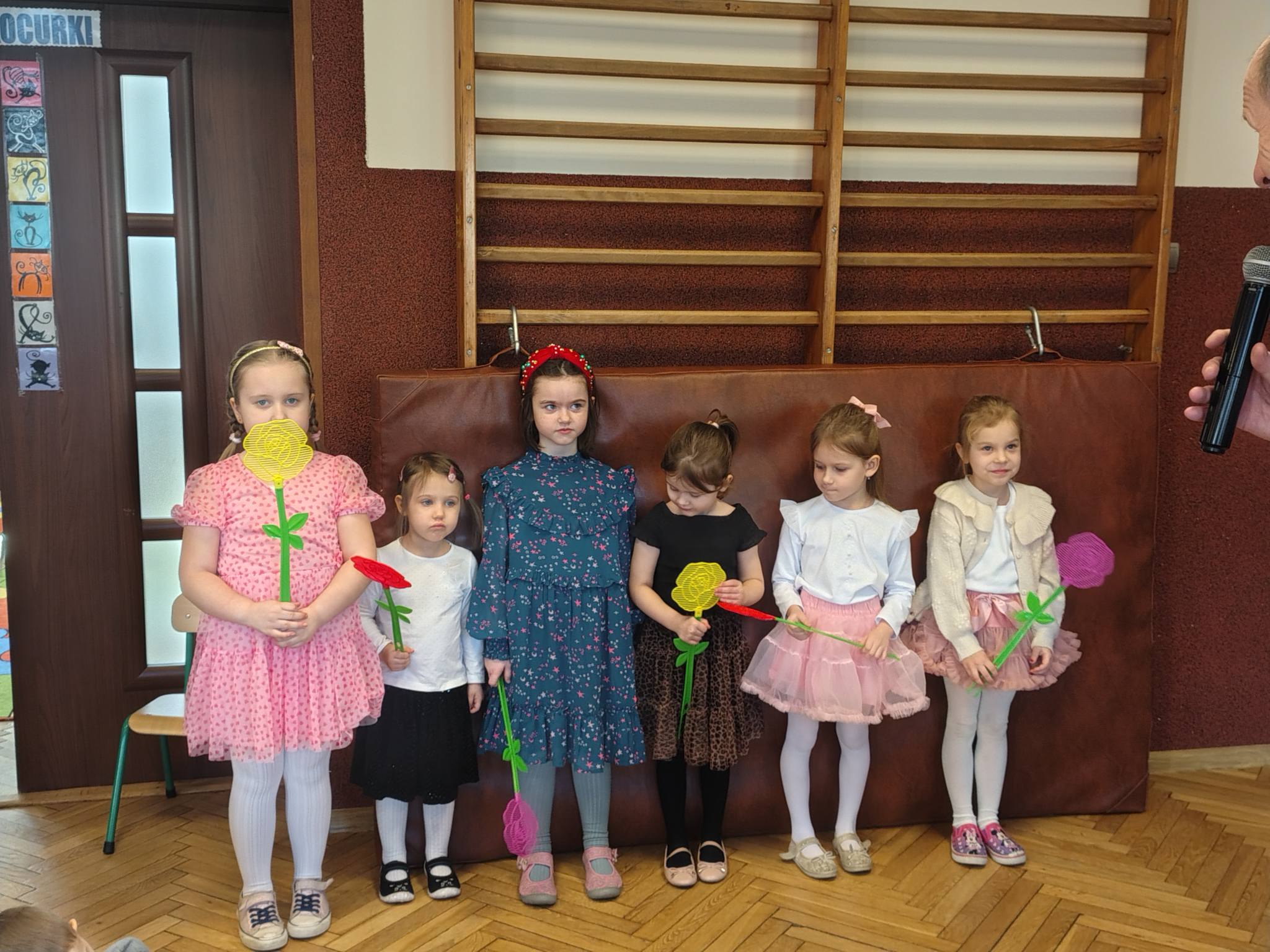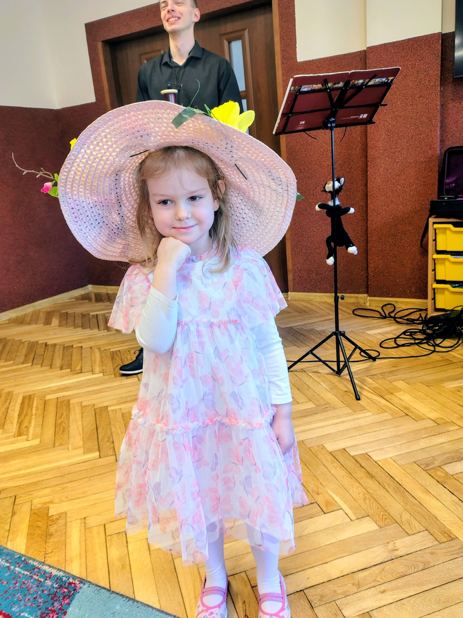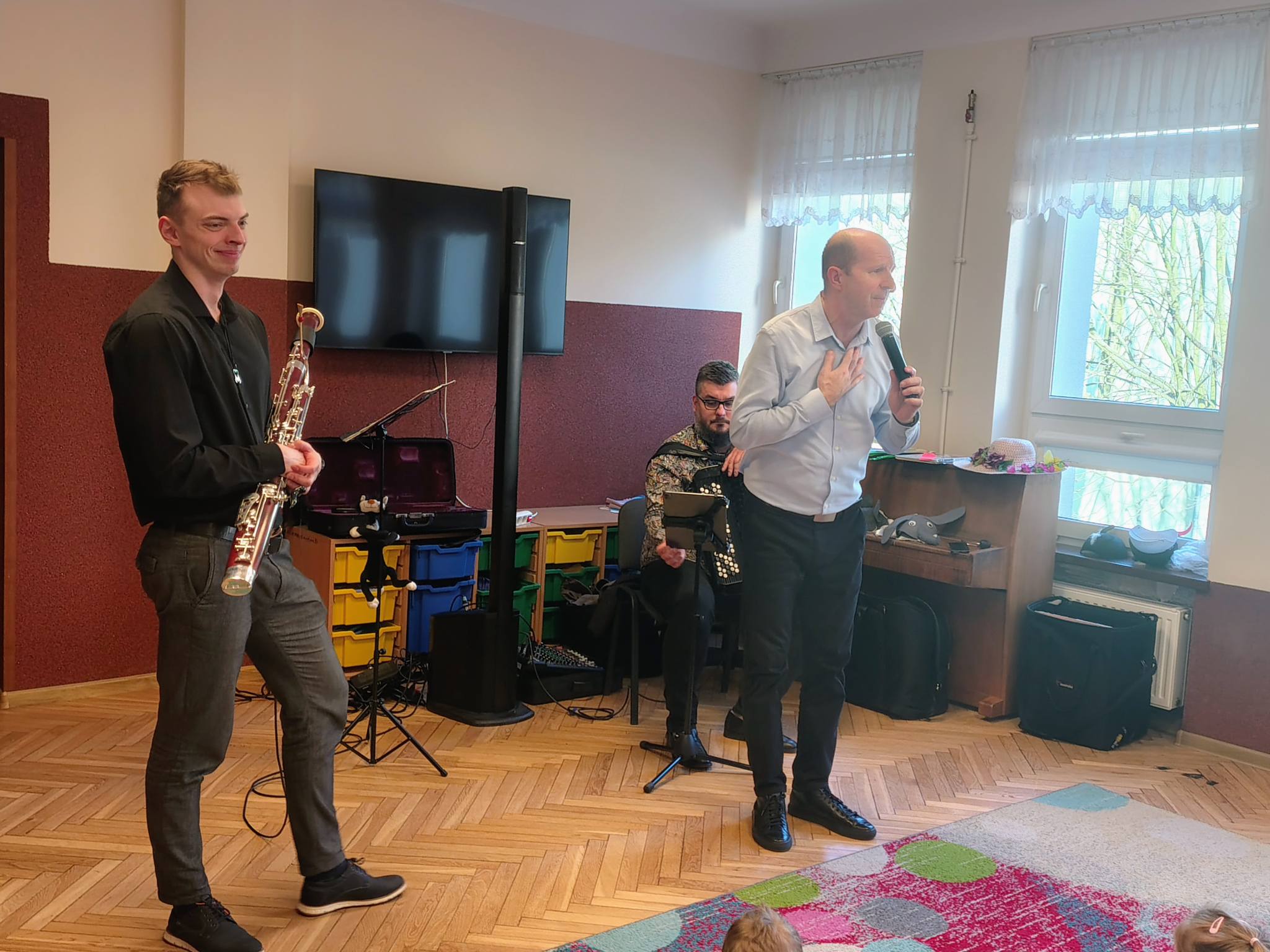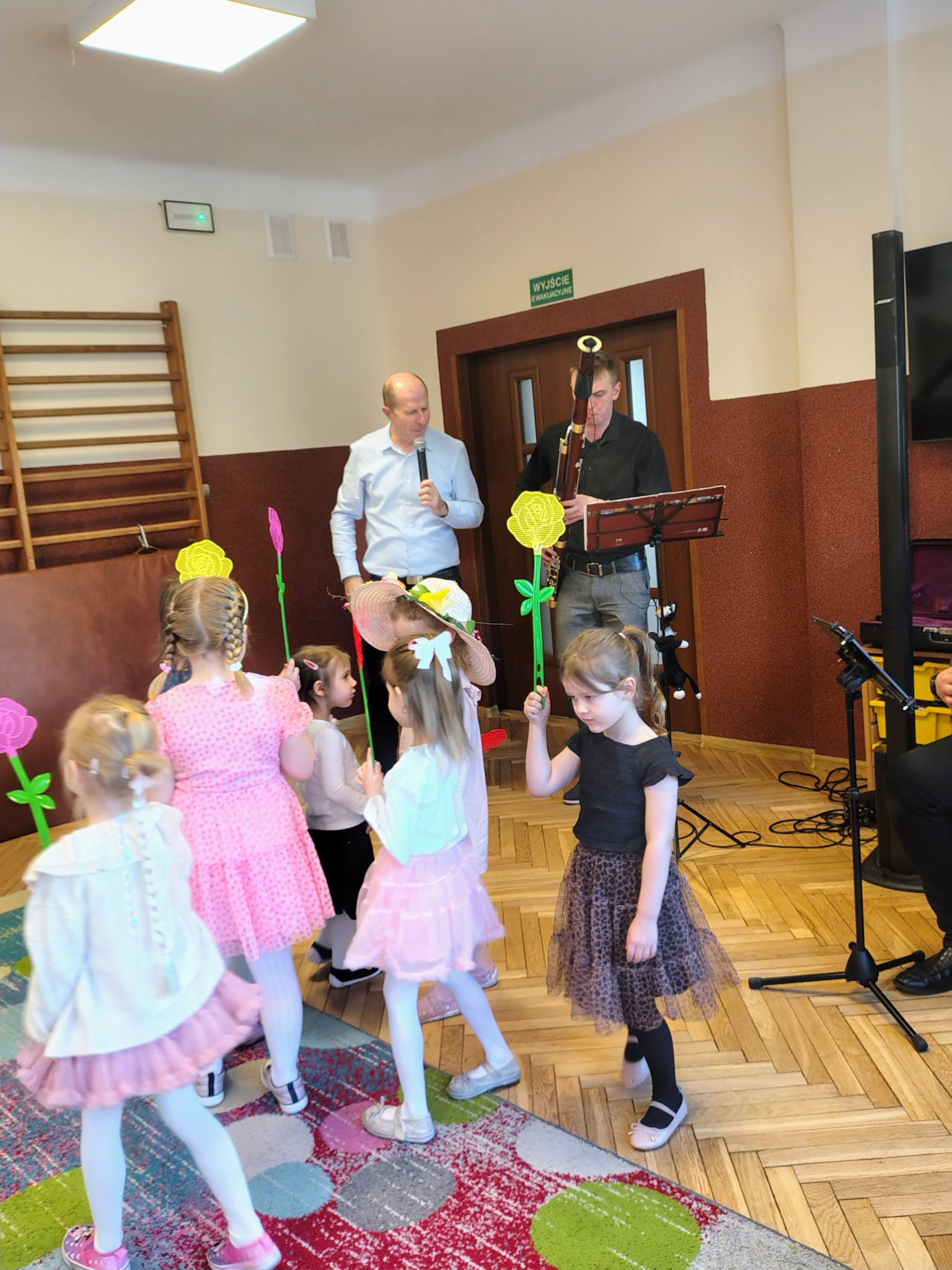 Dzisiejszy koncert był prawdziwą podróżą przez świat muzyki i wyobraźni. Najmłodsi słuchacze mieli okazję poznać niezwykły instrument – fagot. Dzieci usłyszały jego charakterystyczne, niskie i ciepłe brzmienie w utworze „Zabawa w kozackich rozbójników”, które od razu pobudziło muzyczną wyobraźnię.. Następnie przenieśliśmy się do czasów dawnych tańców dworskich. Mali melomani mogli zobaczyć i usłyszeć, jak tańczy się menueta – z eleganckimi krokami i pięknymi ukłonami, niczym na prawdziwym balu. Potem nasza muzyczna wyprawa zaprowadziła nas do ZOO! Tam spotkaliśmy słonia i wysłuchaliśmy utworu „Słoń” z „Karnawału zwierząt” Camille’a Saint-Saënsa, w którym fagot w zabawny sposób naśladował ciężkie kroki wielkiego zwierzęcia. Kolejnym przystankiem była wiosna – rozbrzmiały trzy części „Wiosny” Antonio Vivaldiego, która wprowadziła nas w radosny, pełen śpiewu ptaków i budzącej się natury nastrój. Na zakończenie wszyscy wspólnie zaśpiewaliśmy Balladę o myszce, kocie i fagocie, a nasz koncert zakończył się wyjątkowym momentem – niskie dźwięki fagotu obudziły ze snu zimowego niedźwiedzia, który spał bardzo mocno po długiej zimie! Dziękujemy naszym gościom za wspaniałą energię, uśmiechy i wspólne muzykowanie.
