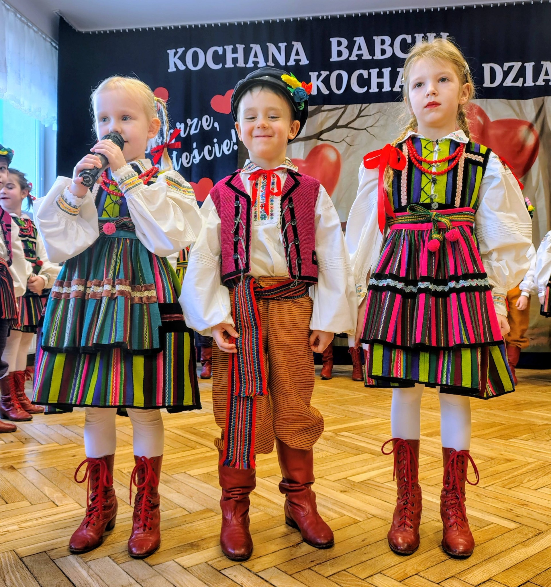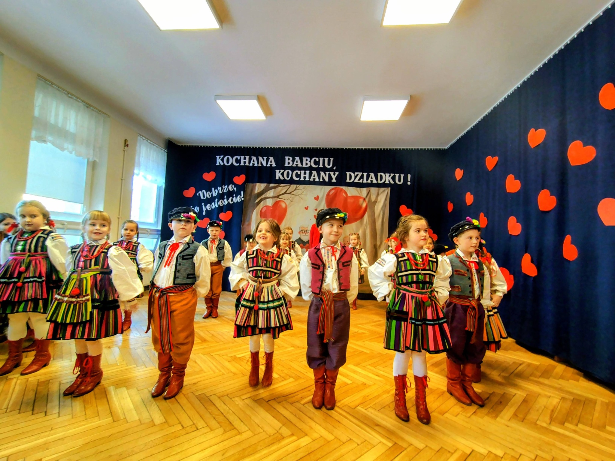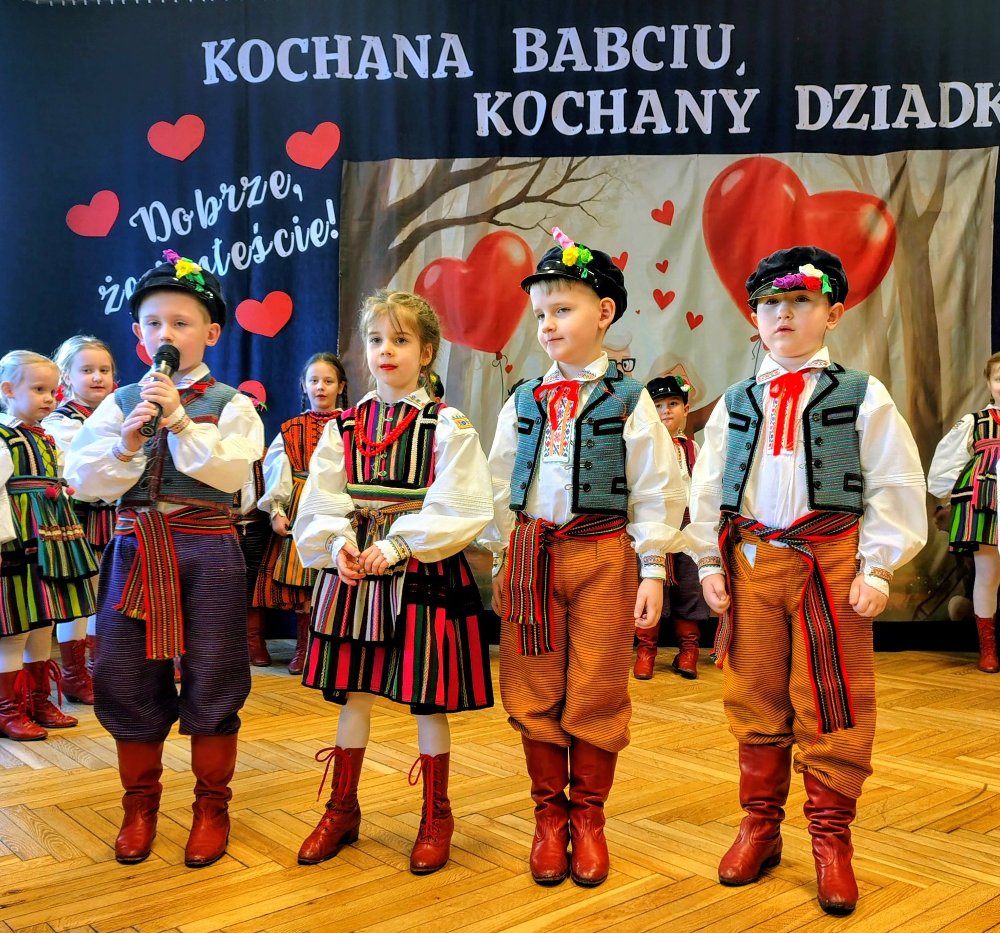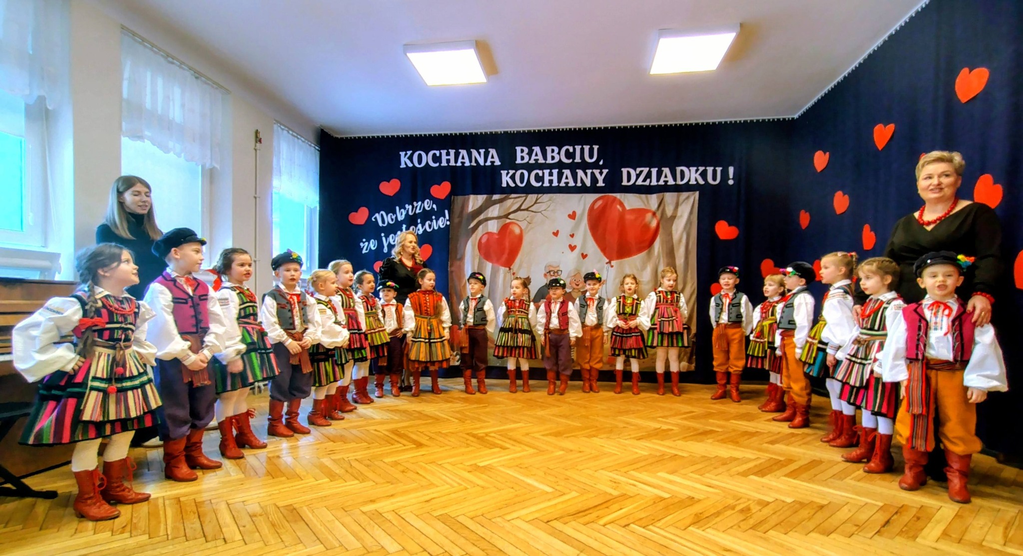 Wspaniały występ naszych starszaków z grupy "Kocurki", " Na ludową nutę" dla kochanych Babć i Dziadków. Nie zabrakło ludowych przyśpiewek i tańców: "Gąsiora" ," Tramblanki" czy "Lipki", a także ludowych pieśni: "W moim ogródeczku", "Czerwone jagody", "Miała baba koguta", czy "Jestem sobie mała wnusia". To był dzień pełen wzruszeń, pozytywnych emocji i wielu wrażeń, które z pewnością zostaną w pamięci naszych gości. Niejedna łezka została uroniona podczas cudownego występu naszych Kocurków. Kochanym Babciom i Dziadkom życzymy zdrowia, pogody ducha każdego dnia, dużo siły, pociechy z wnucząt i samych pięknych dni w szczęściu i miłości.
