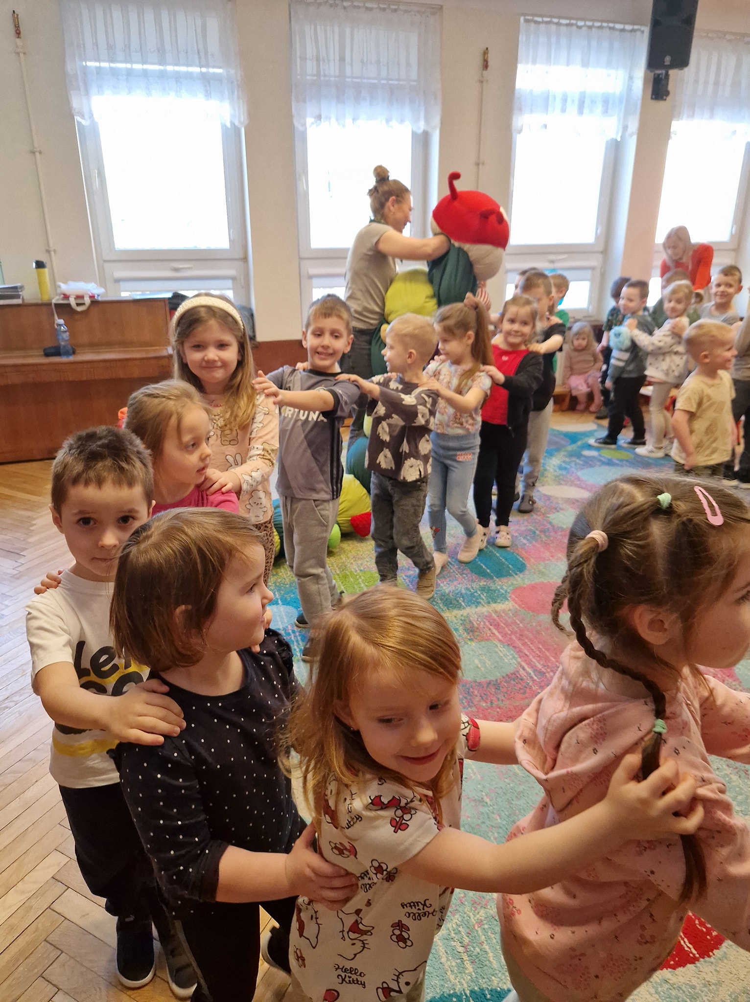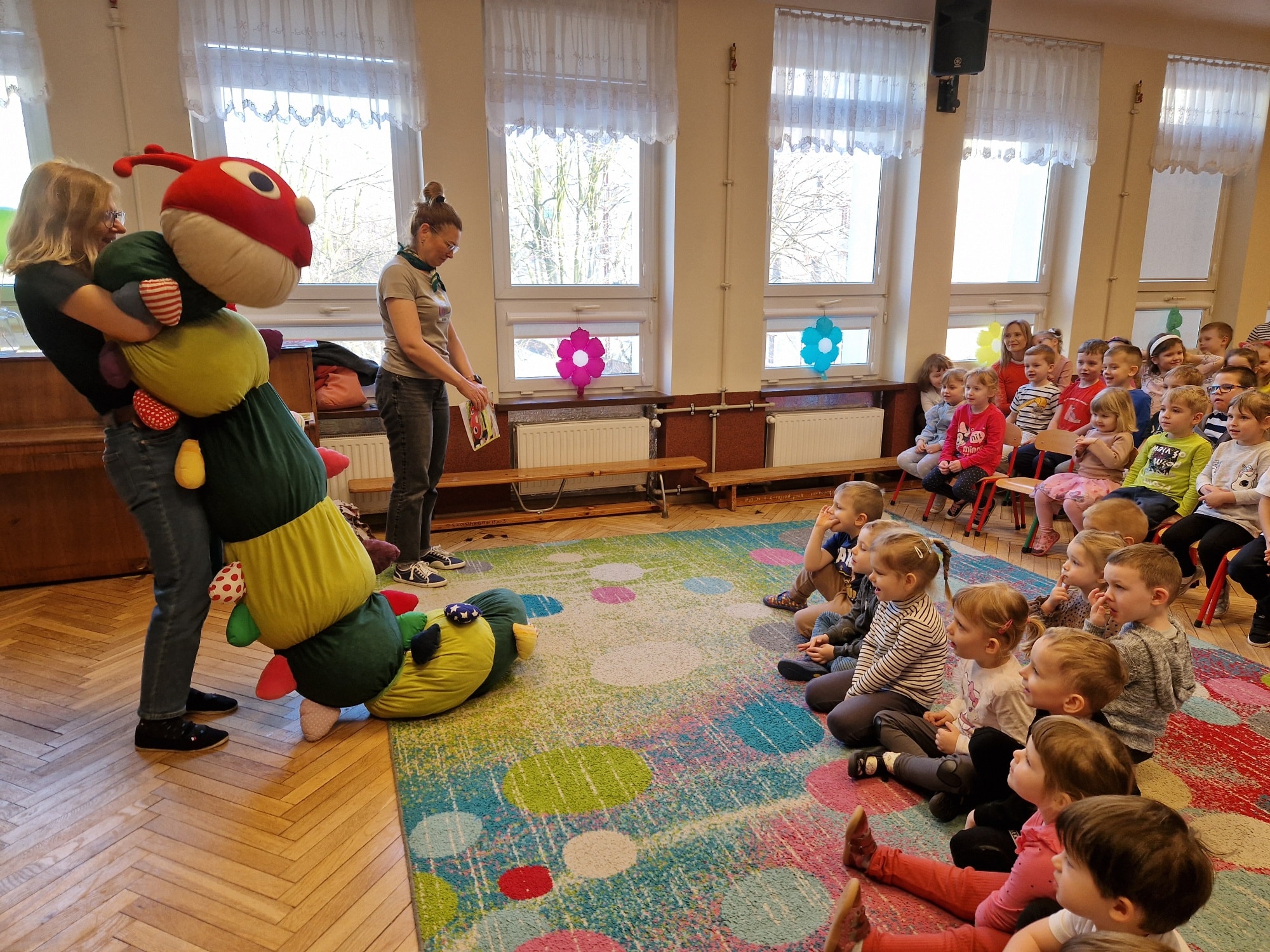 W czwartek 19.02.2026 r. w naszym Przedszkolu odbyło się bardzo ciekawe spotkanie z Panią Barbarą Szelągowską - autorką wielu książek dla dzieci oraz Panią Moniką Jędrychowską, ilustratorką książek. Podczas spotkania dzieci miały okazję dowiedzieć się, na czym polega praca pisarza, ale i ilustratora. Naszym gościom towarzyszyła urokliwa stonoga Jadzia- bohaterka utworu „Stonoga Jadzia i przyjaciele”. Dzieci zapoznały się z ciekawą twórczością pisarki oraz barwnymi ilustracjami, które nadają jej książkom niepowtarzalny, indywidualny charakter. Autorki utworów literackich przypomniały dzieciom także jak należy dbać o książki. Przedszkolaki ze stonogą Jadzią również bardzo chętnie, aktywnie uczestniczyły w wesołych zabawach. Spotkanie przebiegło w bardzo miłej i radosnej atmosferze.