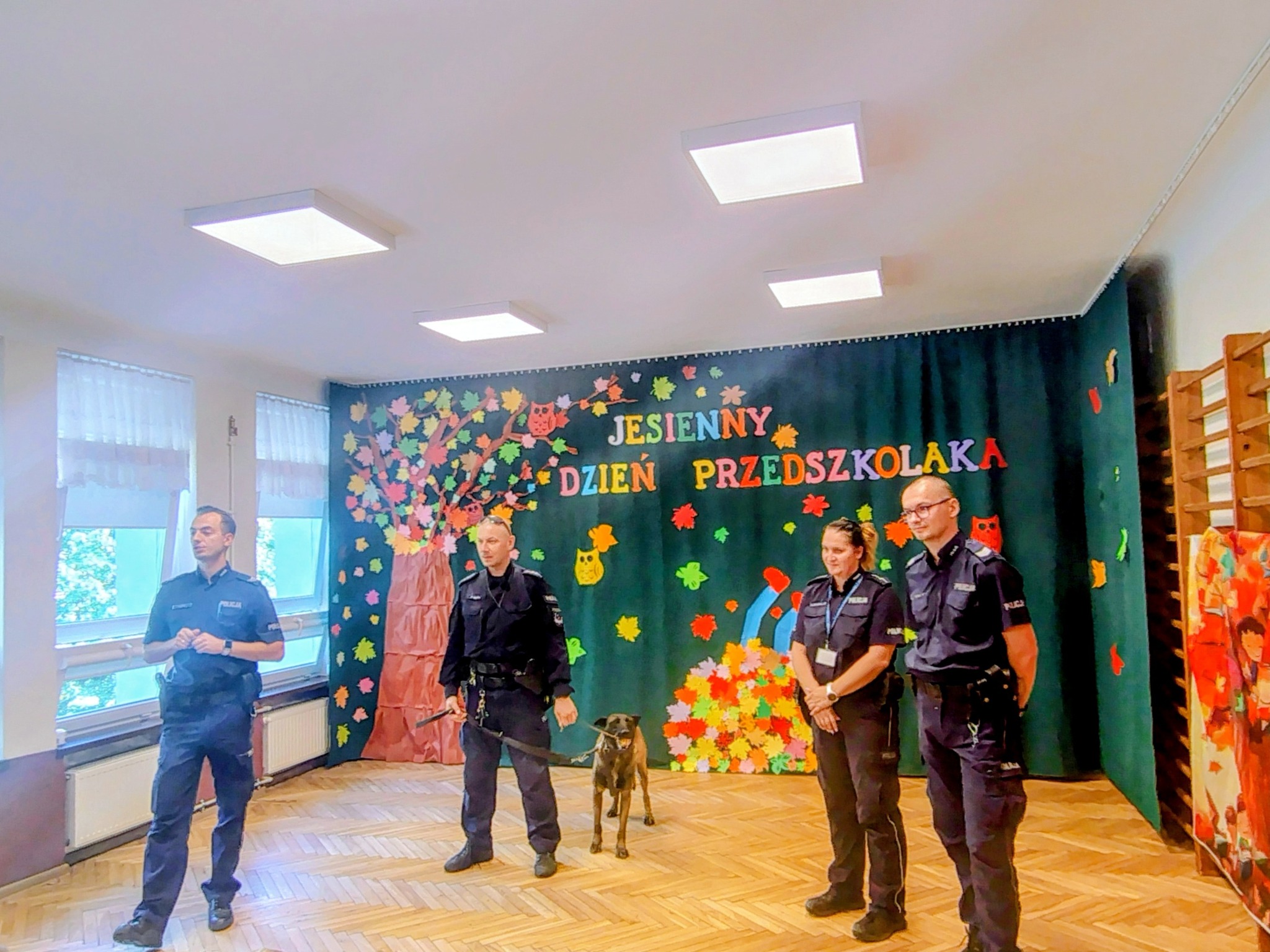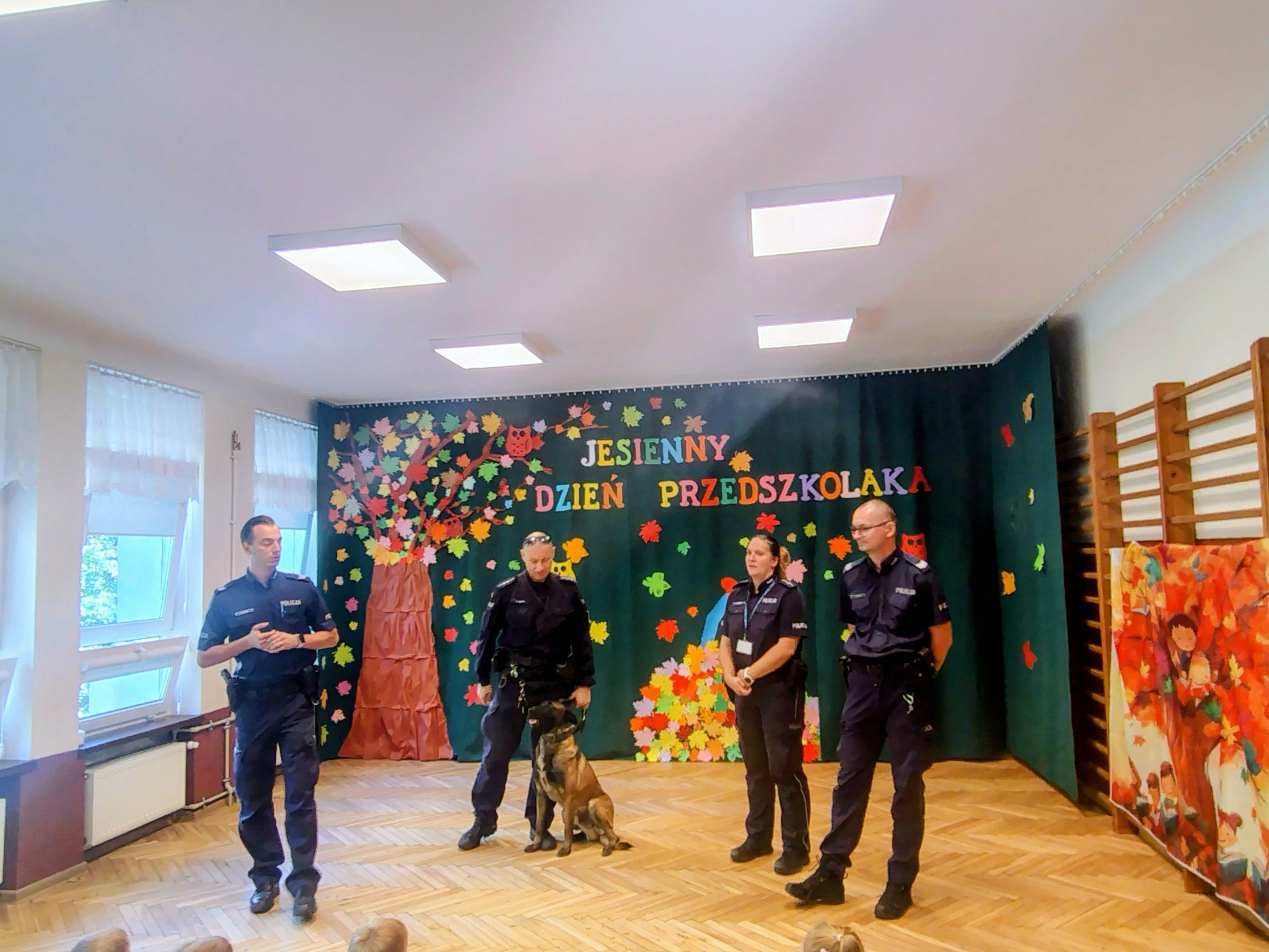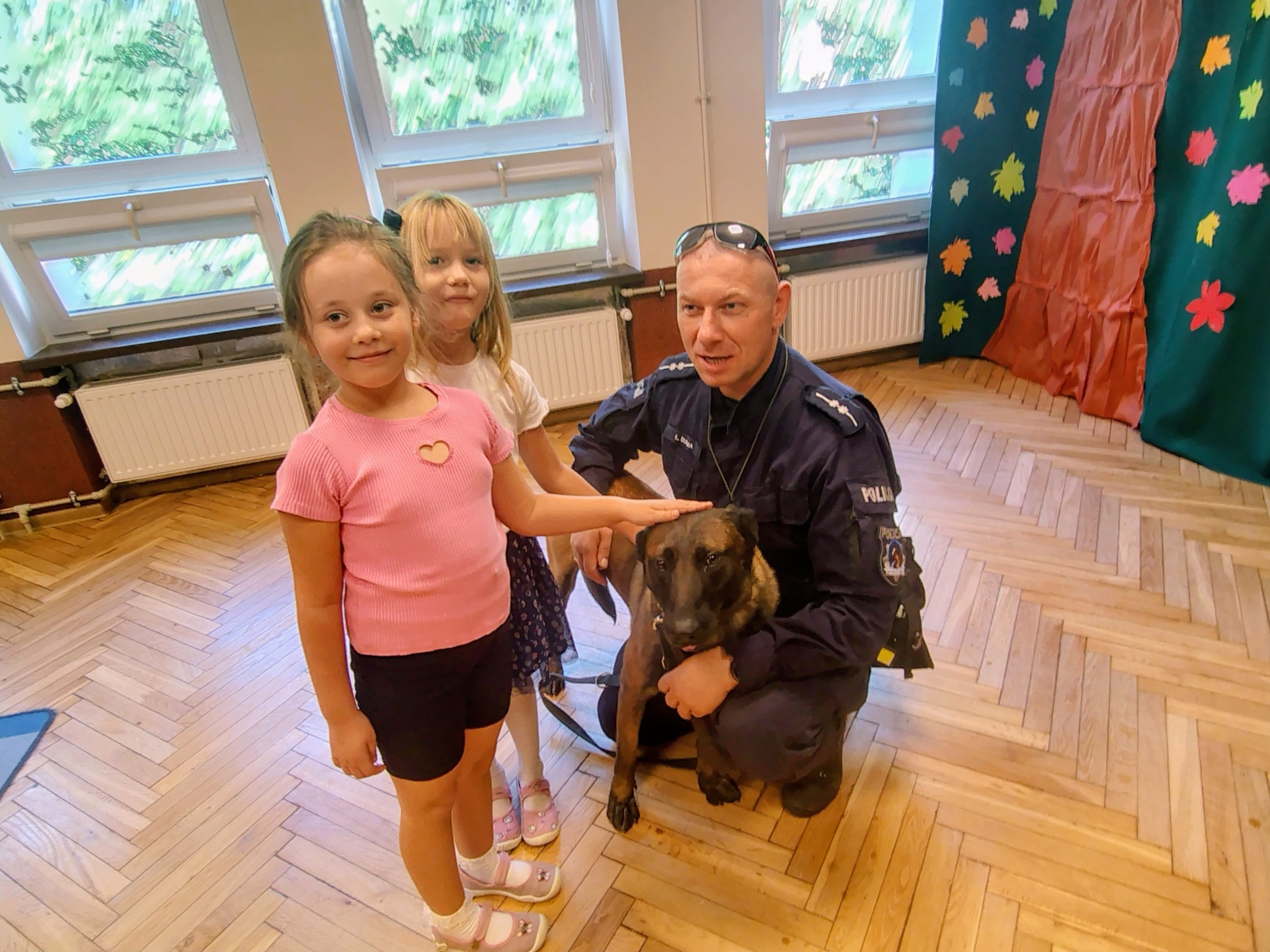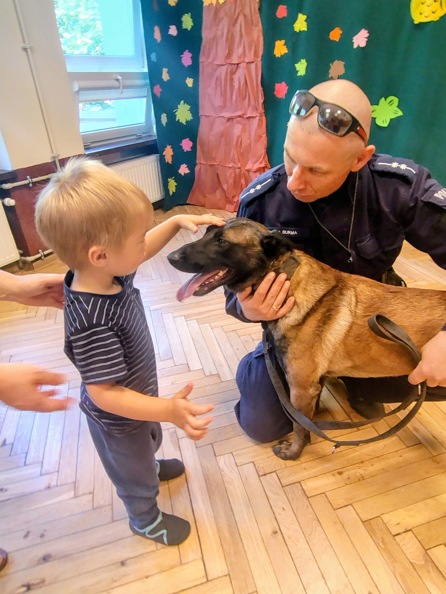 Skaba oraz asp. Łukasz Surma wraz z psem Szewronem. Goście przeprowadzili pogadankę na temat bezpieczeństwa na drodze oraz placu zabaw. Zwrócono uwagę na odpowiednie zachowanie podczas spotkania z nieznajomym. Dzieci dowiedziały się, jak należy postępować, gdy podejdzie do nich obcy pies. Przedszkolaki wiedzą już, że nie należy otwierać drzwi nieznajomemu. Największą atrakcją dzisiejszej wizyty było spotkanie z policyjnym psem, Szewronen, który na co dzień pomaga wykrywać narkotyki. Dzieci miały również okazję zobaczyć, jak wygląda z bliska radiowóz policyjny. Wszyscy byli zachwyceni . Zobaczcie sami, Serdecznie dziękujemy naszym gościom za ciekawe i pouczające spotkanie.