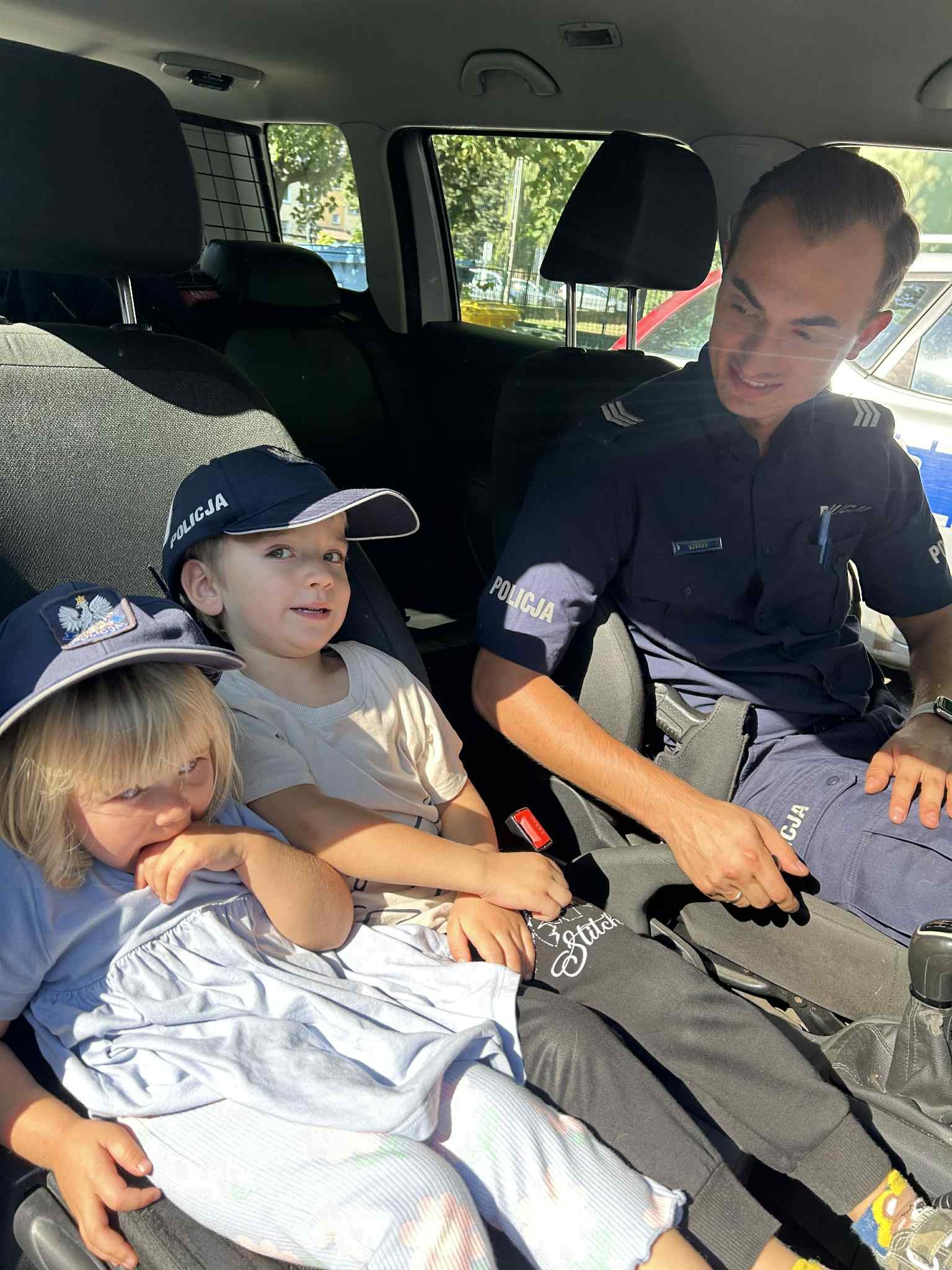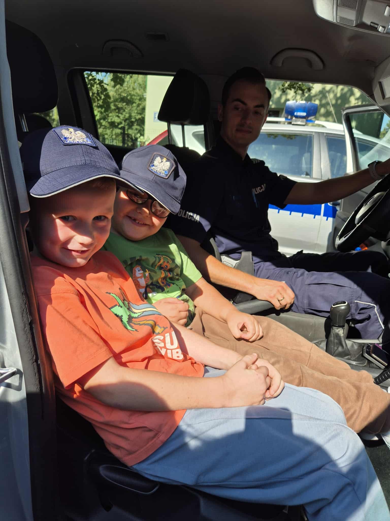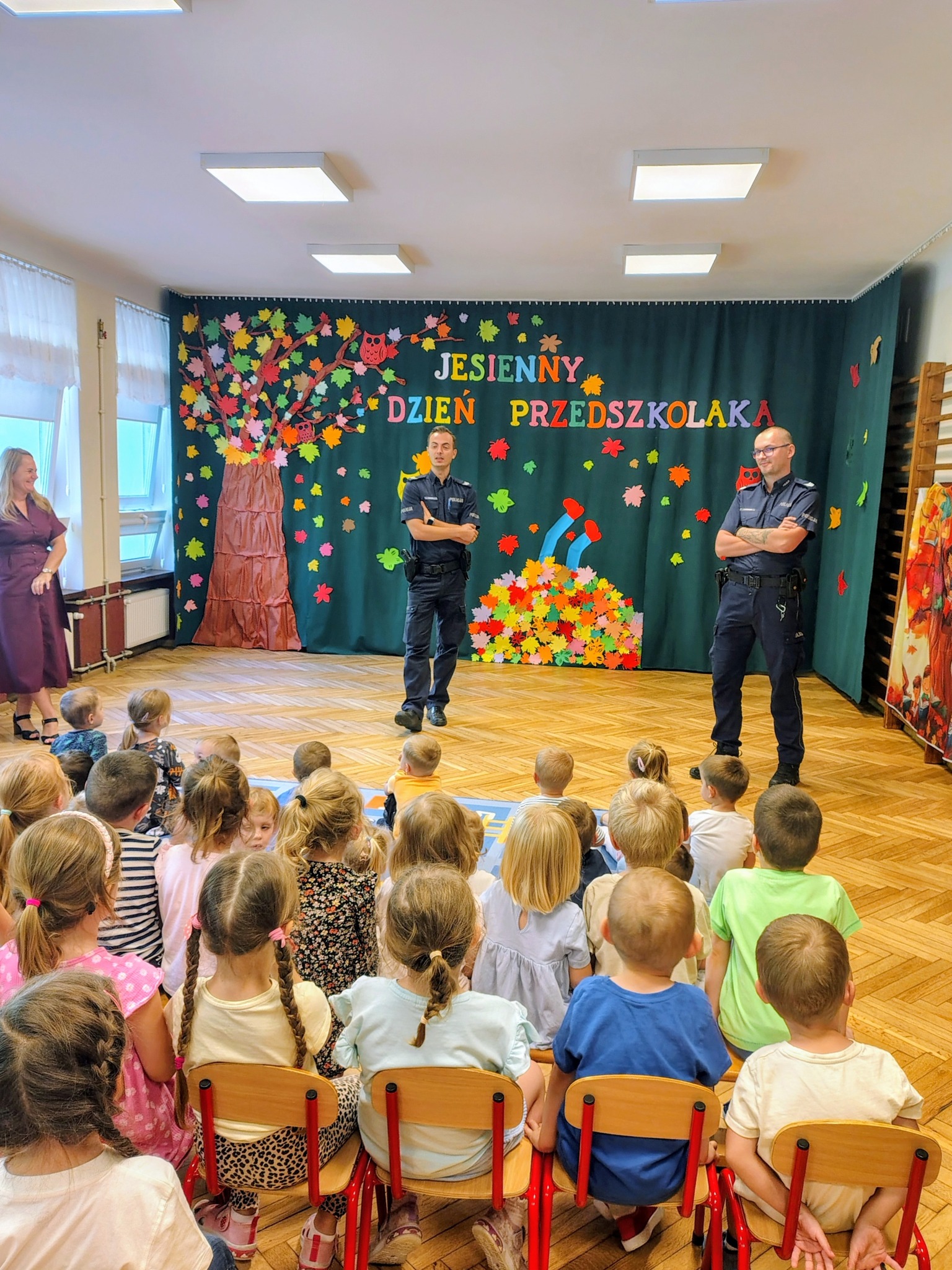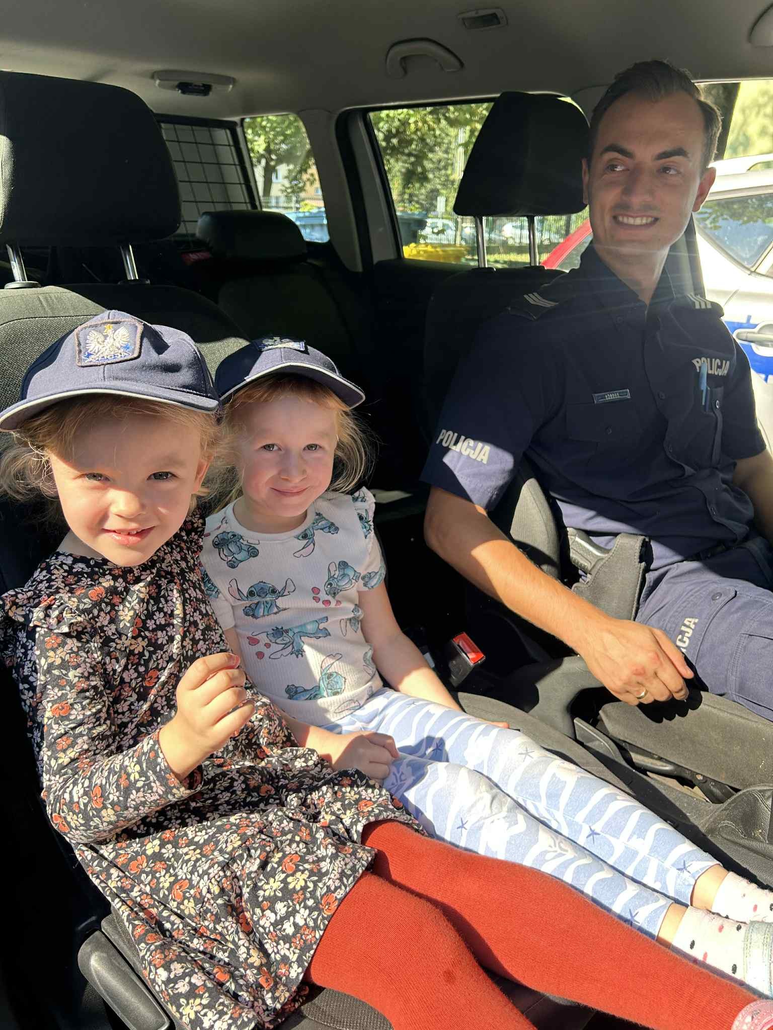 Skaba oraz asp. Łukasz Surma wraz z psem Szewronem. Goście przeprowadzili pogadankę na temat bezpieczeństwa na drodze oraz placu zabaw. Zwrócono uwagę na odpowiednie zachowanie podczas spotkania z nieznajomym. Dzieci dowiedziały się, jak należy postępować, gdy podejdzie do nich obcy pies. Przedszkolaki wiedzą już, że nie należy otwierać drzwi nieznajomemu. Największą atrakcją dzisiejszej wizyty było spotkanie z policyjnym psem, Szewronen, który na co dzień pomaga wykrywać narkotyki. Dzieci miały również okazję zobaczyć, jak wygląda z bliska radiowóz policyjny. Wszyscy byli zachwyceni . Zobaczcie sami, Serdecznie dziękujemy naszym gościom za ciekawe i pouczające spotkanie.